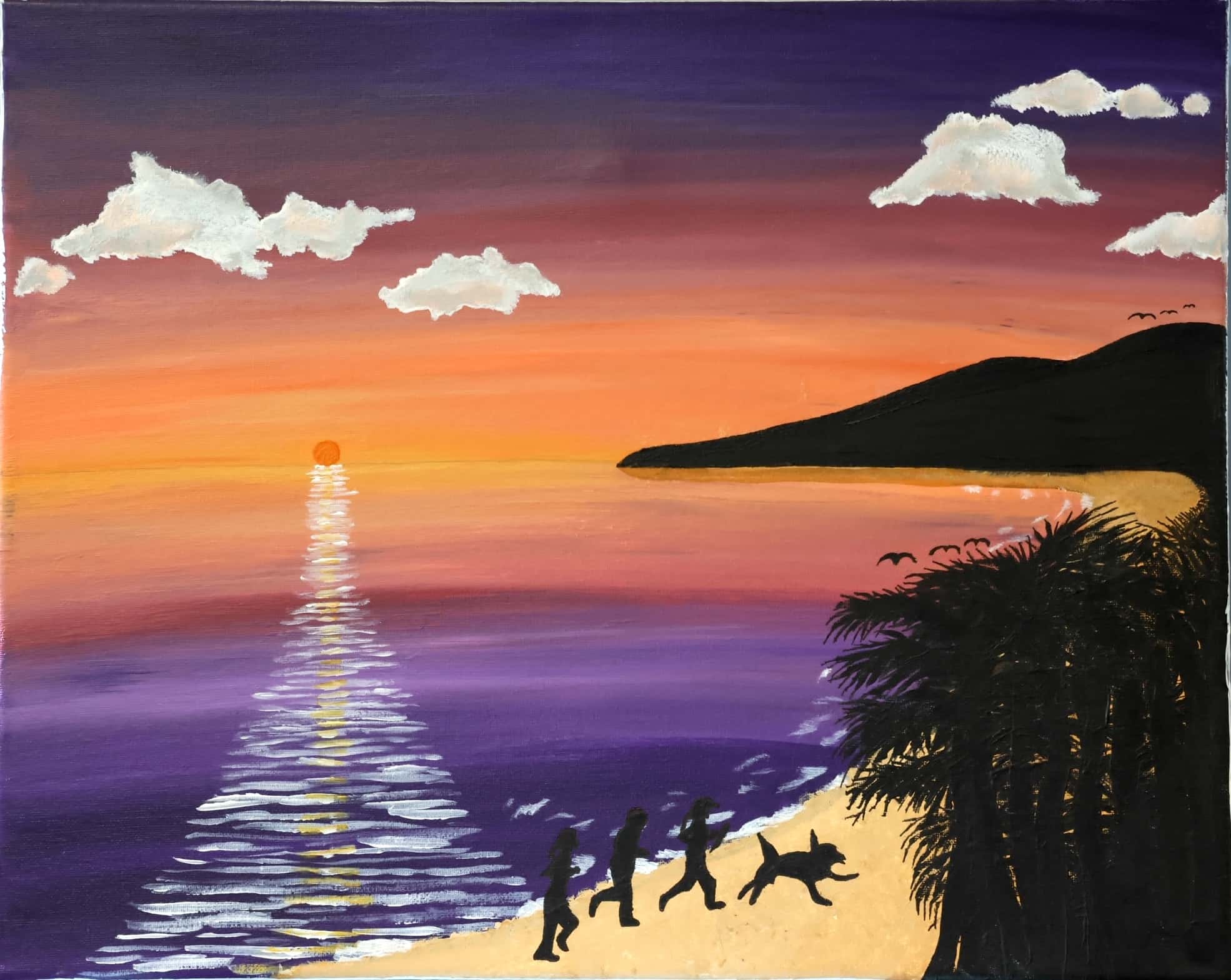 Another example of why this artwork unarguably represents and demonstrates joy is that the three people and the dog represent our family, as we are at our favourite holiday destination, on Four Mile Beach. We are running with our dog on the beach as the sun sets and it makes us feel joy on such a joyous evening. To summarise, this artwork is a well executed and visually appealing piece, and brings happiness when you look at it.