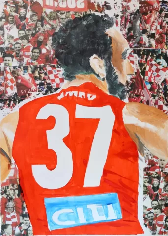 In our world today there are few places where we gather, like Church or School, and celebrate joyfully. My artwork is a painting and photo collage, capturing a moment of joy and hops during the 2012 premiership AFL game. Look past the image of Adam Goodes and focus on the faces of people who show the atmosphere, culture and spirt of community. St Paul recognised the spirituality in everyday life and that is why I chose to paint this joyful scene.