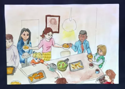My artwork depicts the joy found in sharing meals with family and friends. It has been created using animated and colourful techniques to highlight the joy I feel when we sit and enjoy eating and conversing with each other.