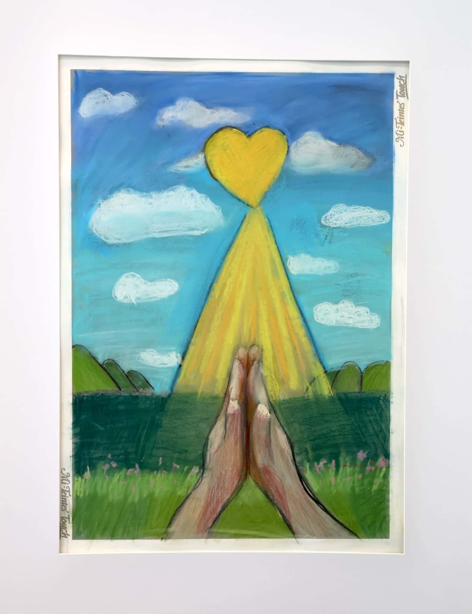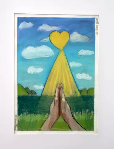 This picture is from my point of view when praying. There is a love heart which represents God, from which the yellow rays of warm sunlight shine hope, and joy down to Earth.