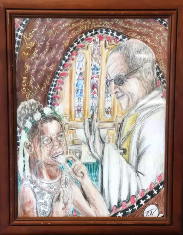 My artwork shows an image of a young child taking the sacrament of the Body of Christ. The other things that are depicted are a Priest and a lovely church setting with a quote. Therefore joy is shown through the joy of the child taking the Body of Christ. In addition to Roman’s (15:13) I chose Roman’s 15:13